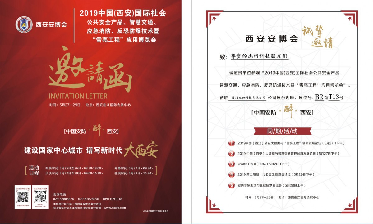 【展會(huì)快訊】杰田科技邀您參觀:2019西安“雪亮工程”應(yīng)用博覽會(huì)!
